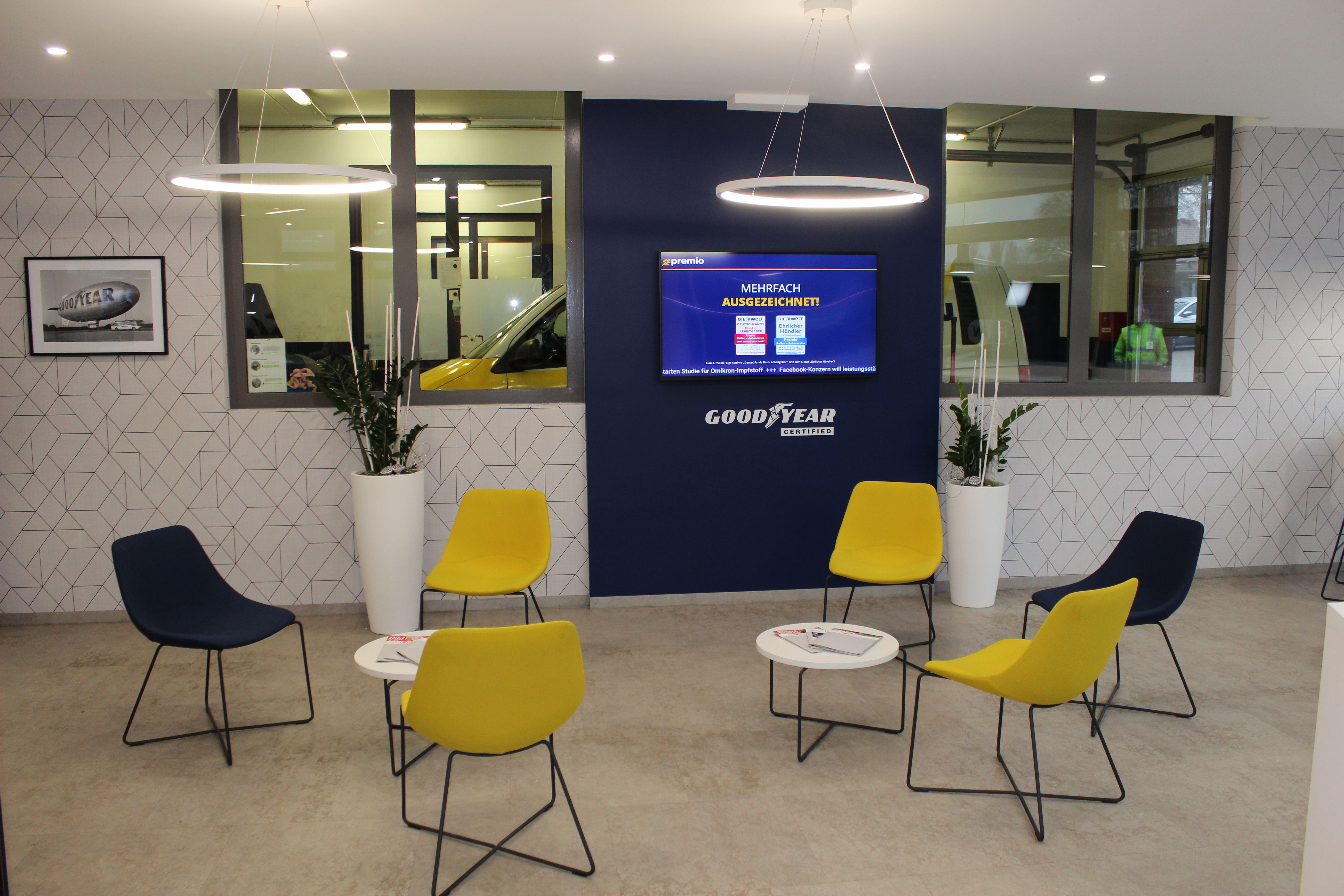 Neben der klaren strategischen Ausrichtung und der stärkeren Visualisierung der Servicekompetenz am Gebäude verfolgt das neue Gestaltungskonzept ein modernes Wohlfühlambiente für den Kunden im Verkaufsraum. Michael Ammann, Marketing Manager Retail bei den Goodyear Retail Systems, freut sich, mit dem neuen Konzept auch optisch eine moderne Servicewelt zu schaffen: „Die Kunden legen zunehmend Wert darauf, dass ihre Werkstatt mit der Zeit geht und sich dementsprechend präsentiert. Mit dem neuen Erscheinungsbild kommen wir nicht nur den Kundenbedürfnissen nach, sondern unterstreichen die Kompetenz unserer Partner hinsichtlich erstklassigem Reifen- und Autoservice. Zudem bieten wir den Premio-Kunden bei ihrem Besuch in unseren Stores mit Angebotsmonitoren, Instore-TV und bequemen Sitzmöbeln Infotainment und eine gemütliche, vertrauensvolle Atmosphäre mit Lounge-Charakter“.