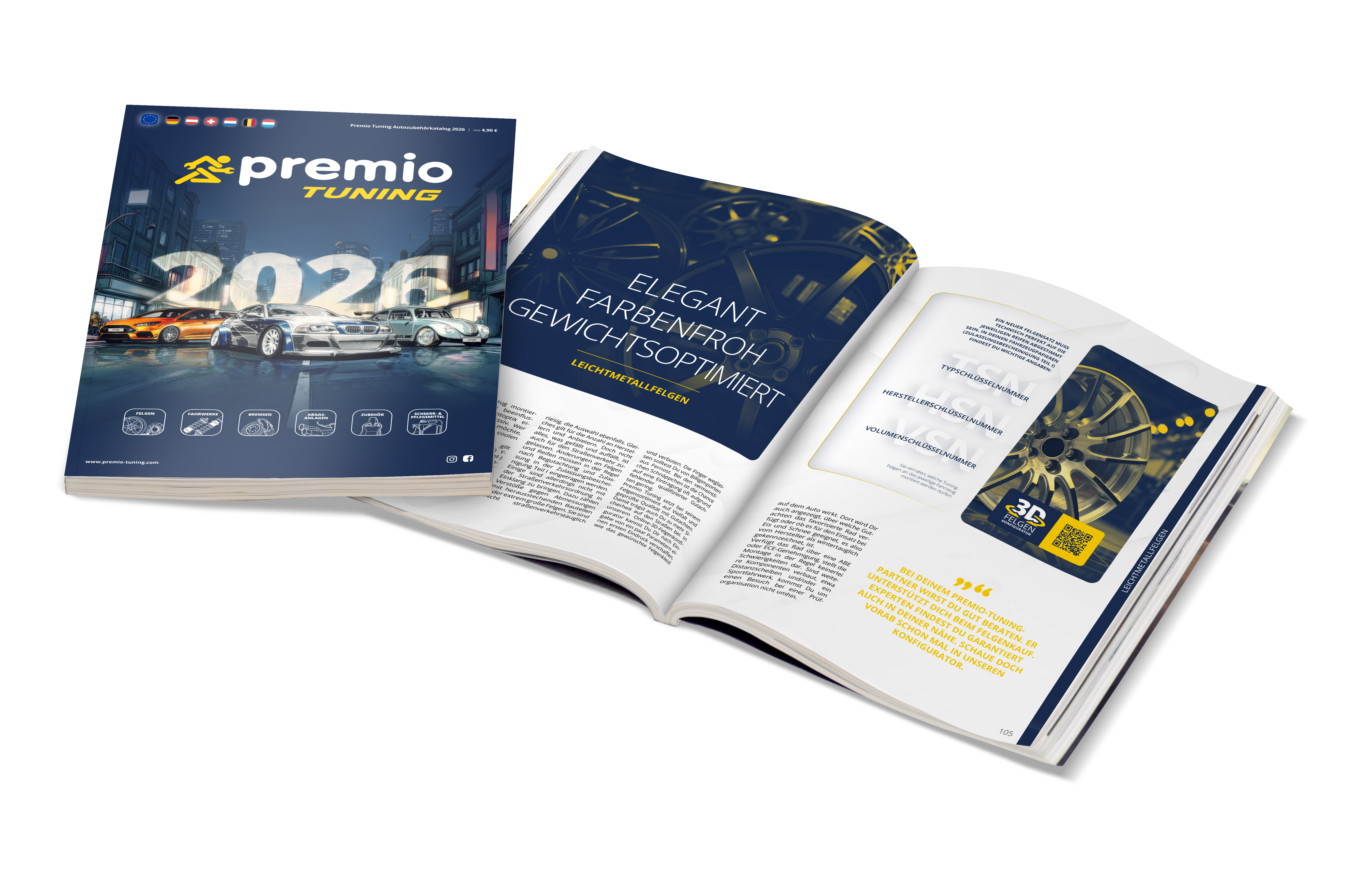 Met deze uitbreiding is de 27e editie van de gevestigde Premio Tuning-catalogus nu ook in Nederland verkrijgbaar – bij de lokale dealers of online als bladerbare catalogus op https://epaper.premio-tuning.com. Op 300 pagina's laat het naslagwerk zien wat er speelt in de internationale tuningwereld, welke producten en stijlen momenteel in de belangstelling staan en hoe moderne voertuigveredeling er vandaag de dag uitziet.
