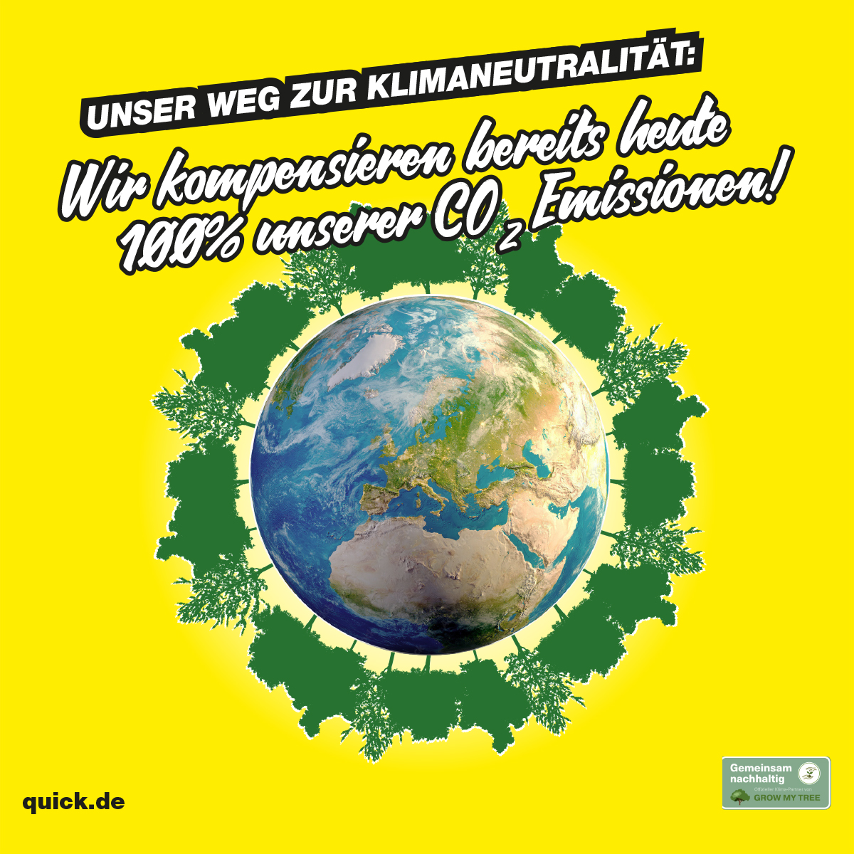 Gemeinsam mit Grow my Tree unterstützt Quick den CO2-Emissionsausgleich durch das Pflanzen von Bäumen. Hierbei werden nicht nur globale Aufforstungsprogramme unterstützt, sondern zudem eine Vielzahl an sozialen Projekten gefördert. Im Ausgleich von CO2-Emissionen hat Quick bereits ein ordentliches Tempo vorgelegt: Aktuell werden schon mehr als 100 % der Emissionen kompensiert und Quick gilt somit bereits jetzt als klimaneutral. Klimaneutral ist ein Unternehmen, wenn seine CO2-Emissionen berechnet und mit Unterstützung anerkannter Klimaschutzprojekte ausgeglichen werden.