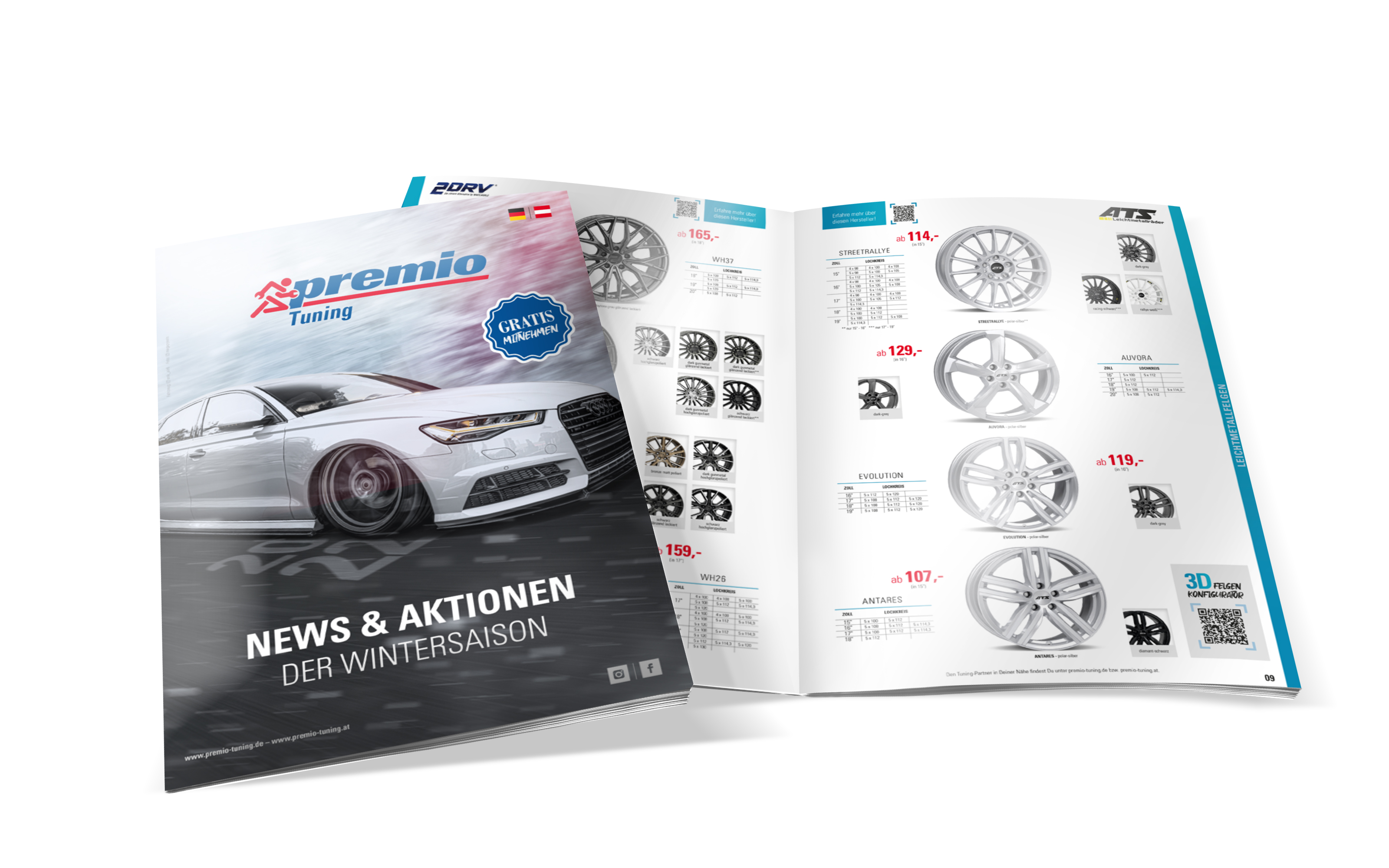 Pünktlich zur Umrüstsaison liegen die aktuellen Premio Tuning Winternews bei fast 500 Partnern in Deutschland und Österreich zur kostenlosen Mitnahme aus. Mehr als ein Dutzend Felgenmarken sind darin vertreten und präsentieren Highlights aus dem aktuellen Sortiment. Diese können direkt per QR-Code über das Smartphone bzw. Tablet gescannt und virtuell mithilfe des 3D-Felgenkonfigurators am eigenen Fahrzeug montiert werden. Kompetente Beratung und die passenden Reifen dazu gibt es ergänzend beim Premio-Tuning-Partner vor Ort.